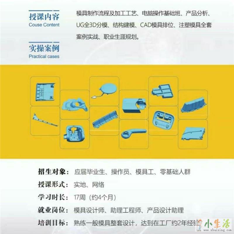 出图熟悉HASCO,DME MISUMI等出口模设计标准,毕业生能熟悉工厂设计程序,达到工厂2-3年模具设计经验统全面的学习注塑模具设计流程和方法